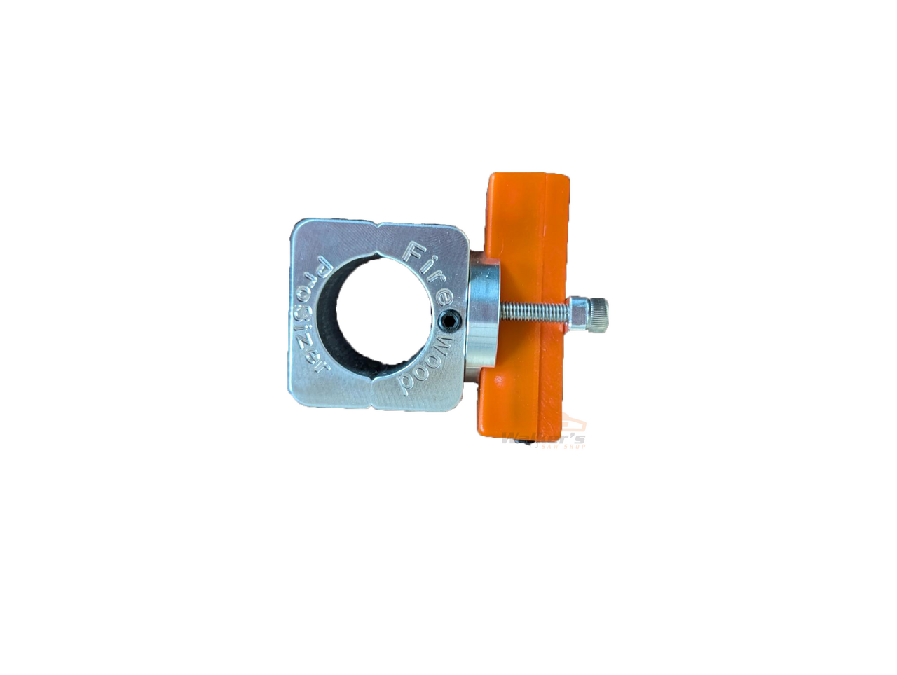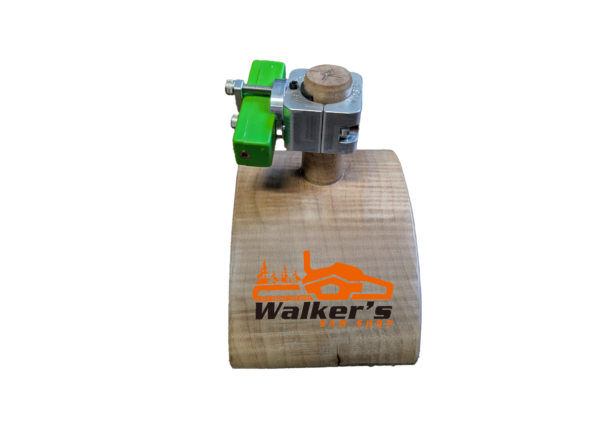 Aluminum CNC’d clamp WITH SWIVEL function. Ideal for moving the laser mark up-or downward on the log to where it works best for you. Attach the clamp away from the oil cap. Bright laser, lasts at least 8 hours (red) on one charge. Rechargeable. On-off button.