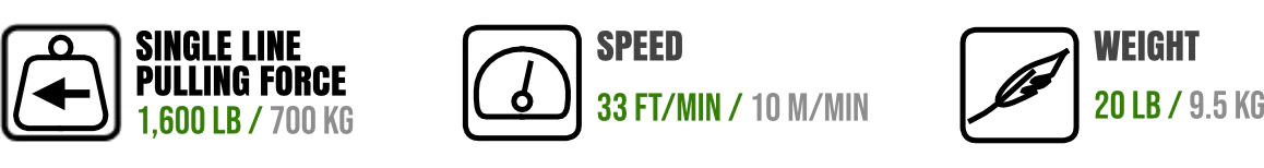 Powered by Honda GX35 4-stroke engine, 360° inclinable and air-cooled. The PCW3000 can pull up to 700 kg (1,600 lbs.) without mechanical advantage. Add a pulley system, you can go up to five times (5x) the pulling power. That means, with two double pulleys, you could move up to 3,500 kg (8,000 lb)!